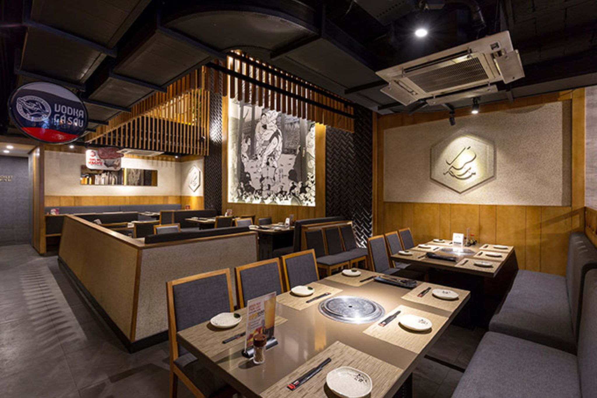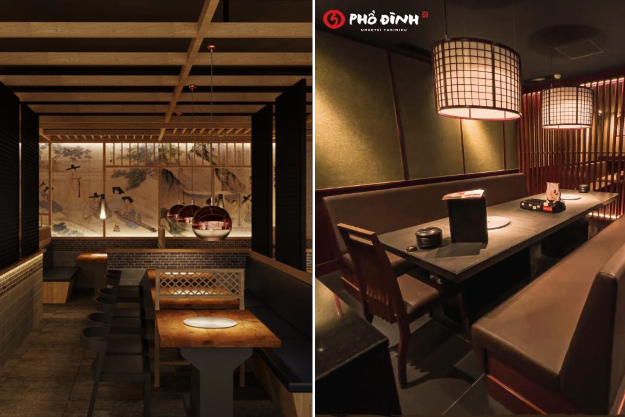 Thiết kế không gian Yakiniku thiên về sự riêng tư và cao cấpDưới góc nhìn thiết kế, Yakiniku phù hợp với tinh thần ấm, sang và riêng tư hơn. Không gian thường ưu tiên gỗ tối màu, ánh sáng vàng ấm và các booth ngồi riêng để khách có thể tập trung vào trải nghiệm nướng thịt.