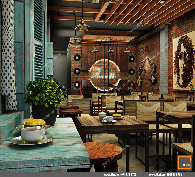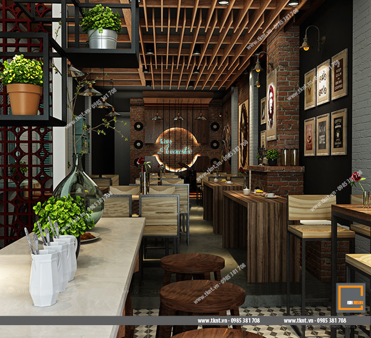 Thiết kế nội thất quán cafe với phong cách cổ điện với những gam màu trầm, vân gỗ sử dụng gỗ là chủ yếu.