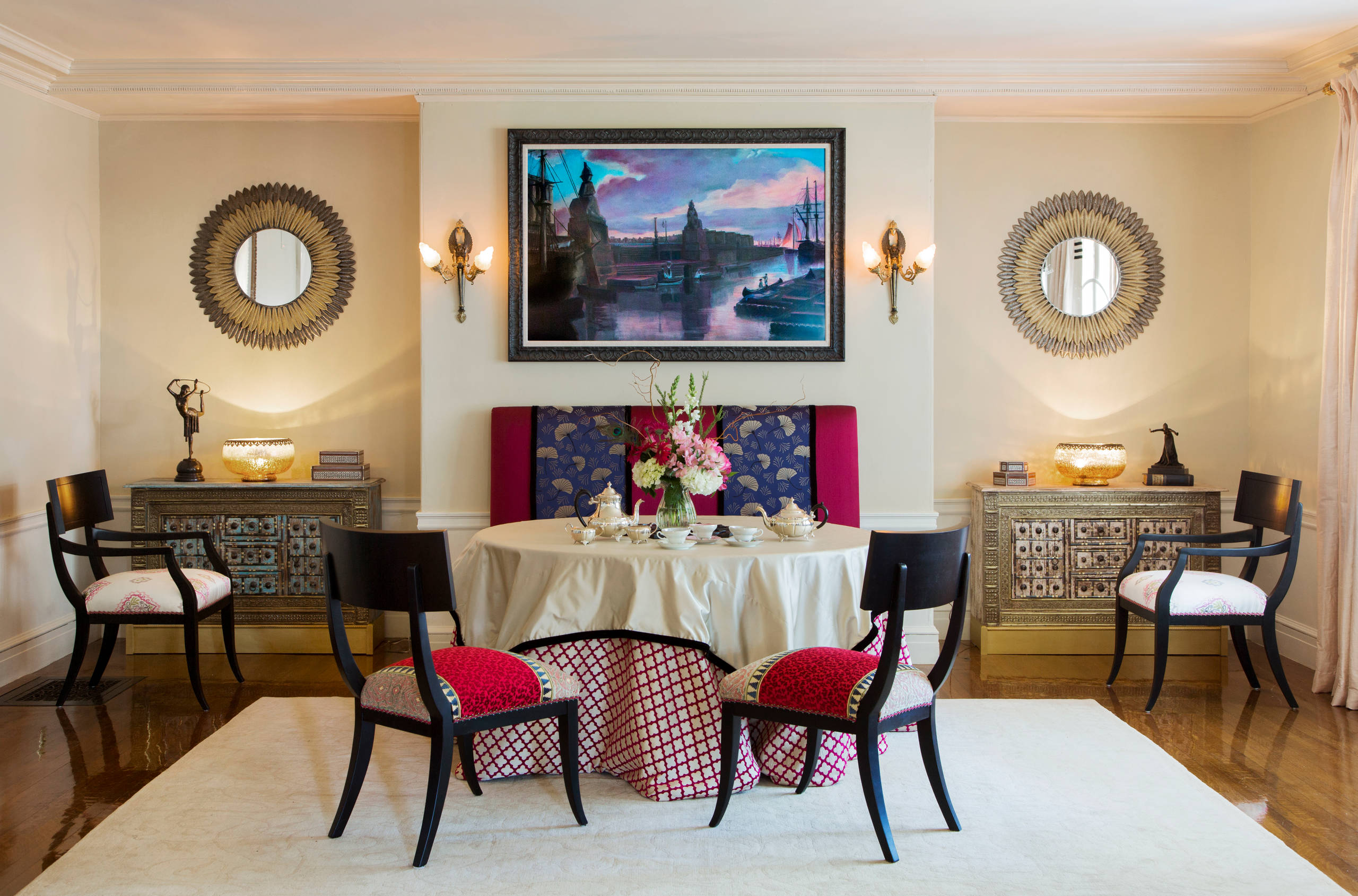 Màu sắc: Màu sắc trong các thiết kế nhà hàng tân cổ điển nên chọn những tone nhẹ nhàng như kem, xám, xanh lam, vàng và xanh lá. Màu đen ánh, đỏ, vàng và bạc thường được sử dụng chủ yếu như những mảng màu để làm nổi bật phong cách tổng thể. Những chi tiết phào chỉ nhẹ nhàng và lan tỏa cũng góp phần tạo ra một cái nhìn sang trọng từ sàn đến trần cho không gian nhà hàng tân cổ điển.