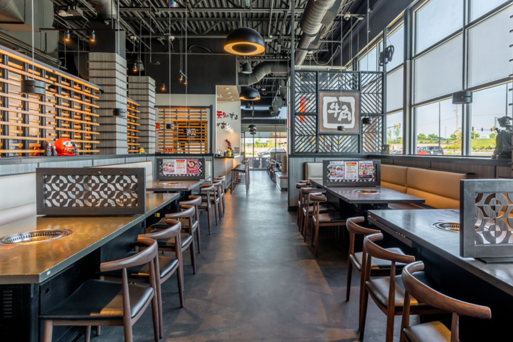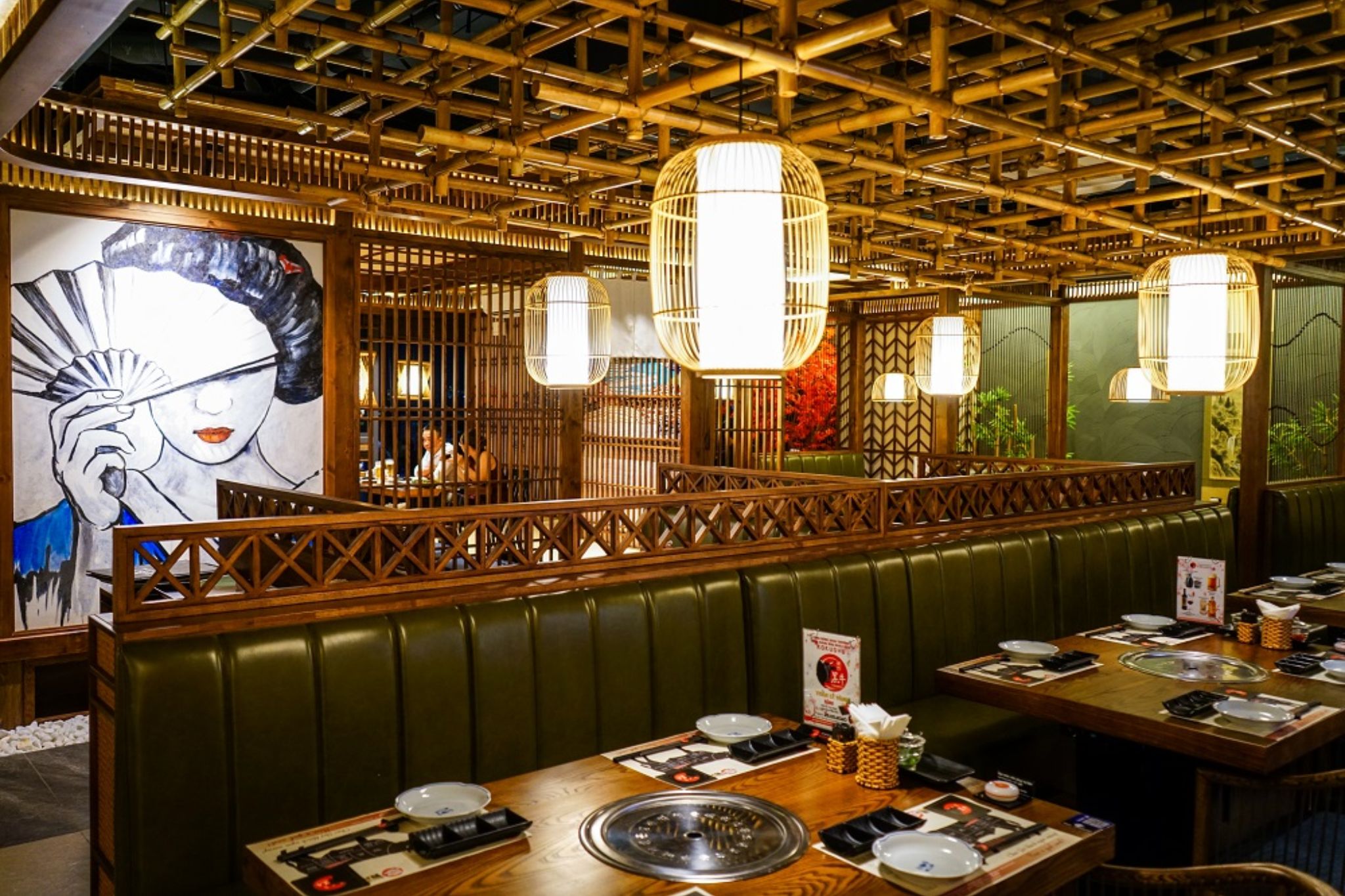 Thiết kế không gian Yakiniku thiên về sự riêng tư và cao cấpDưới góc nhìn thiết kế, Yakiniku phù hợp với tinh thần ấm, sang và riêng tư hơn. Không gian thường ưu tiên gỗ tối màu, ánh sáng vàng ấm và các booth ngồi riêng để khách có thể tập trung vào trải nghiệm nướng thịt.